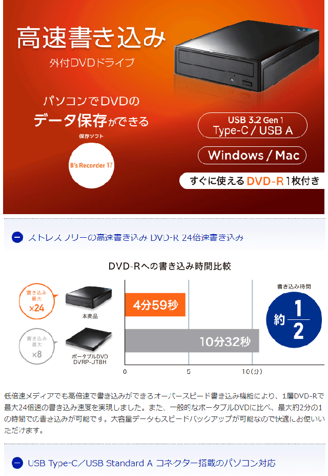 DVRUC24 超高速!最大24倍速で書き込める。100年メディアM-DISCにも記録可能な外付ドライブ