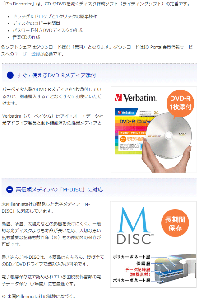 大切な記録も長期間保存できるM-DISCに対応し、データライティングソフトを標準添付していますので、DVDやCDへのデータ書き込みや音楽CDの作成に最適です。また、すぐに使えるバーベイタム製のDVD-Rメディアを1枚添付しています。