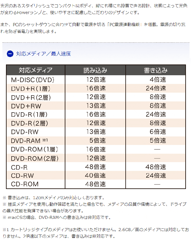 | 書込みエラー 防止機能 | DVD書き込み、CD書き込みともに搭載 |