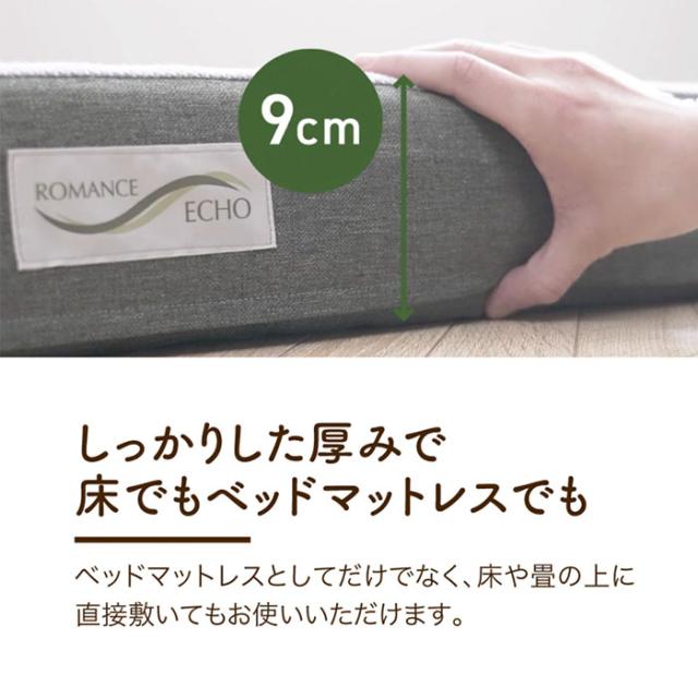 約9cmのしっかりとした厚みでベッドでも床、畳の上に直接敷いていお使いいただけます。