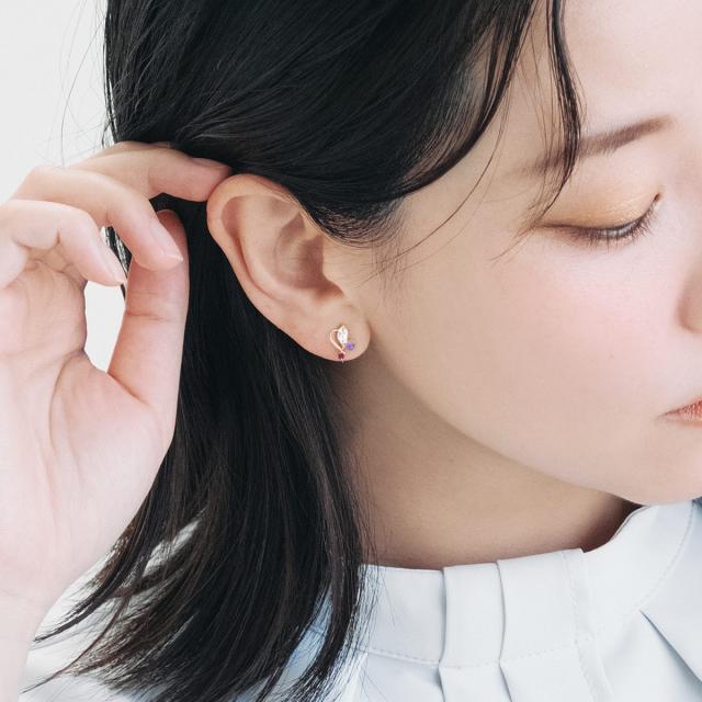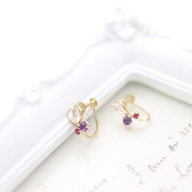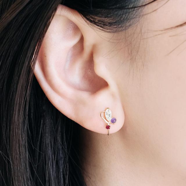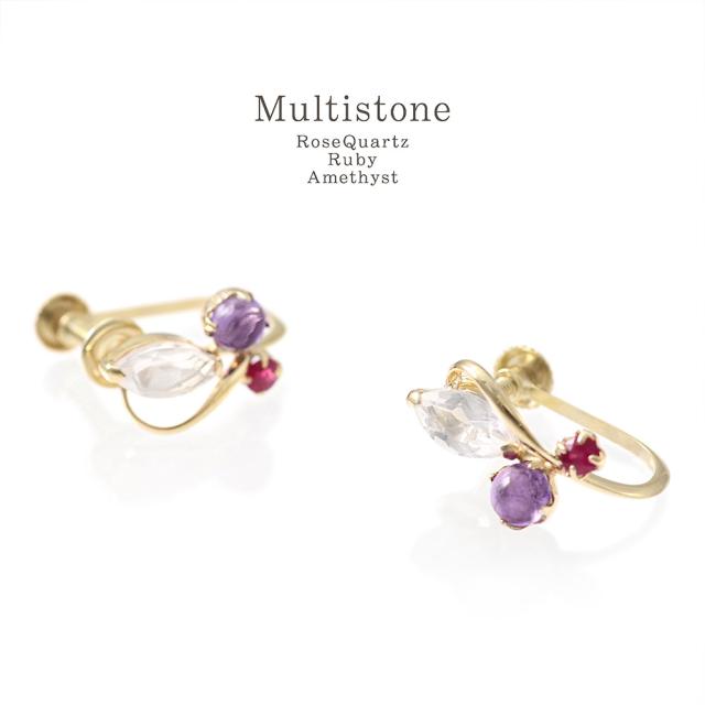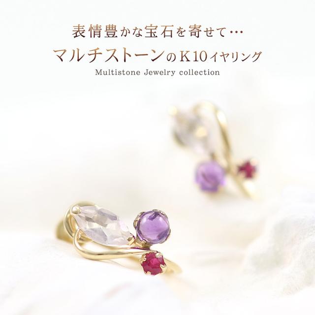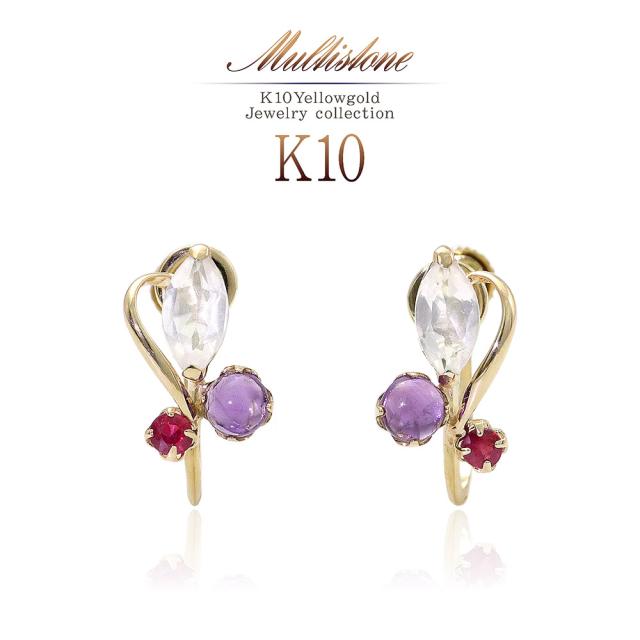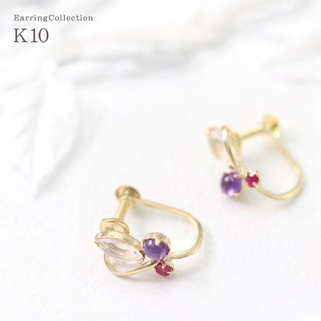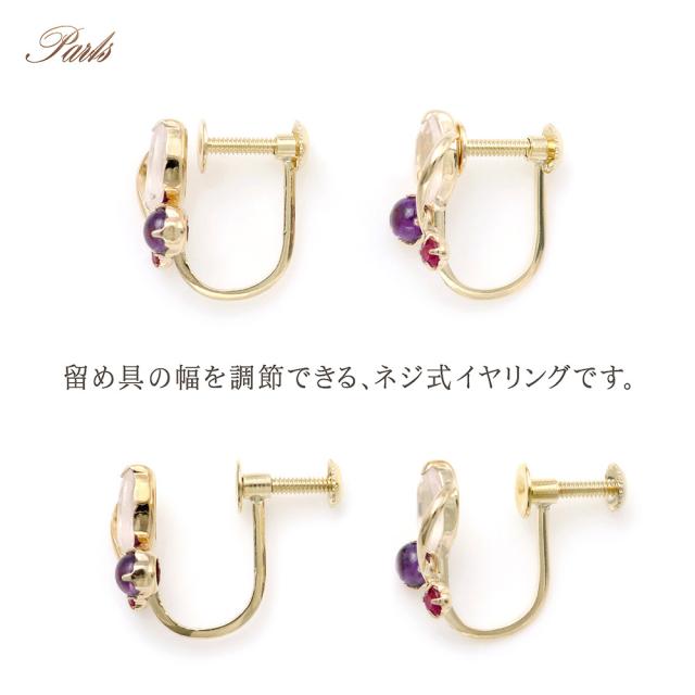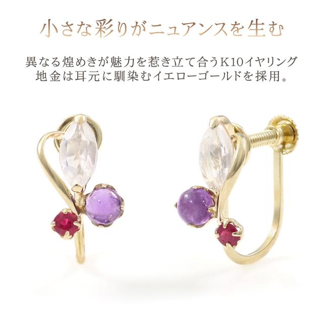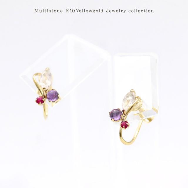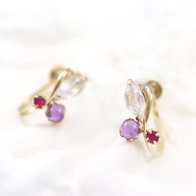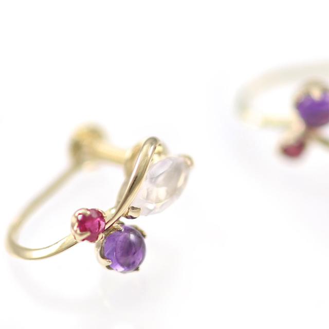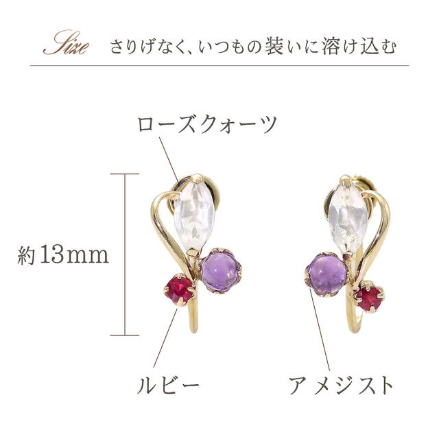 | 地金・素材 | ・ローズクォーツ マーキスカット ・アメジスト ラウンド カボションカット ・ルビー ラウンドカット ・地金:K10YG(10金イエローゴールド) ・イヤリング留め具:ネジ式 ※刻印箇所等は画像と異なる場合がございます。 |