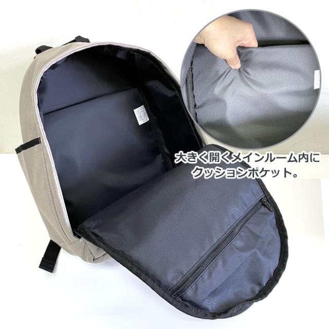 大きく開くメインルーム内には大きなファスナーポケットとクッション入りポケット、サイド・フロント・背面にもポケットを備えていますので細かな荷物を整理して持ち運べます。