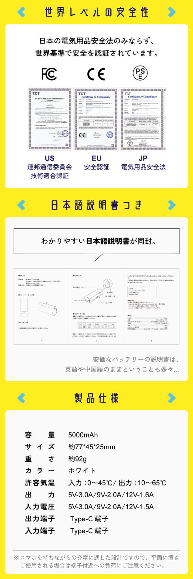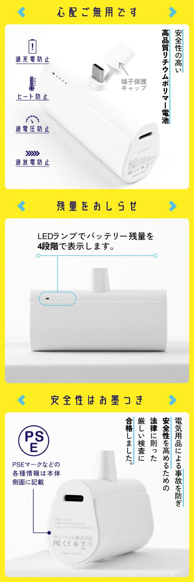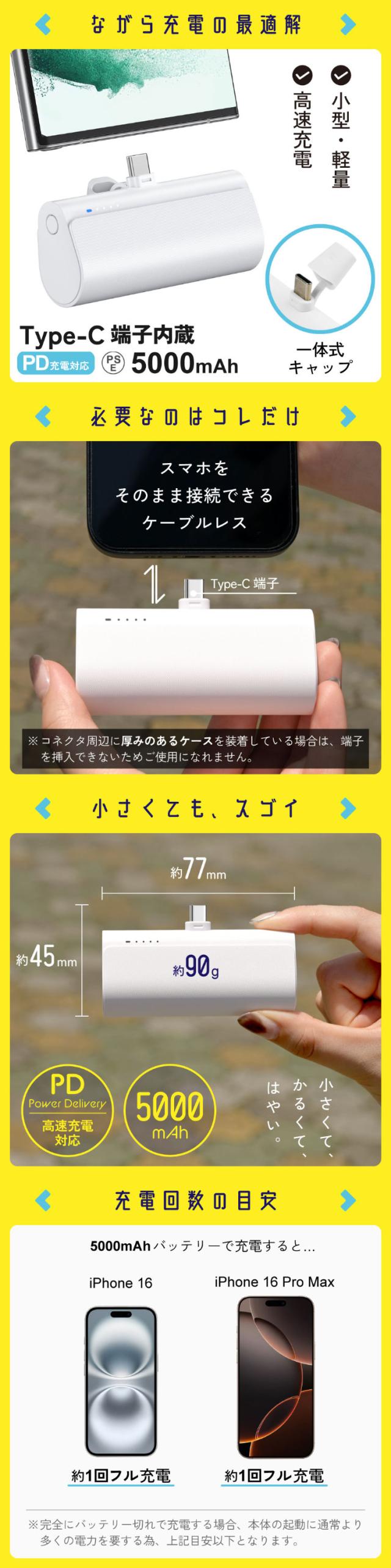 モバイルバッテリー 大容量 5000mAh 小型 持ち運び ながら充電 PD充電対応 急速 残量表示 PSE認証 コンパクト 防災 軽量 Type-C スマホ アイフォン iPhone ケーブルレス