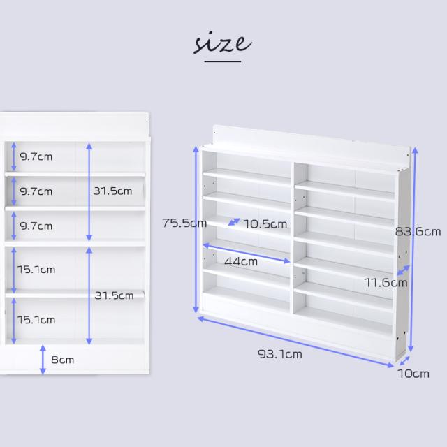 本体内寸(1段あたり):幅44cm×奥行10.5cm×高さ31.5cm、15.1cm(可動棚4枚使用時)、9.7cm(可動棚8枚使用時)