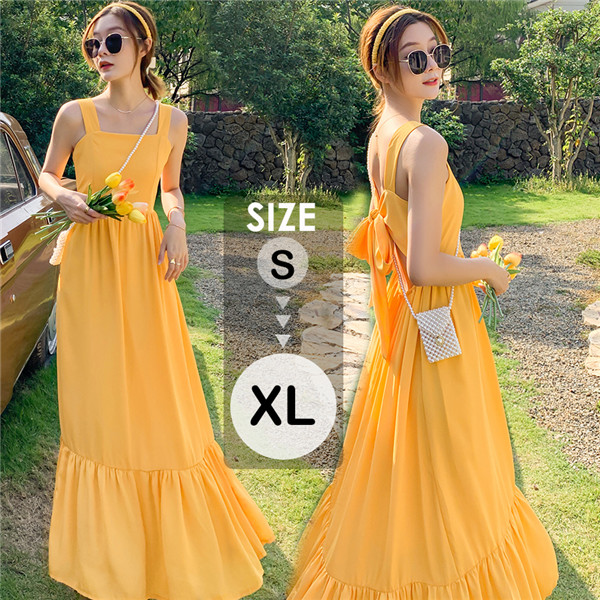キャミソールワンピース ワンピース 夏ワンピース リゾートワンピース ティアード フリル ロング丈 袖なし 夏ワンピ きれいめ 大人可愛い 上品 お嬢様 ドレス ハワイ 結婚式 イエロー S M L XL dd025x2x2l9