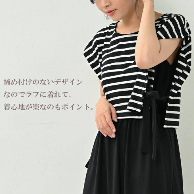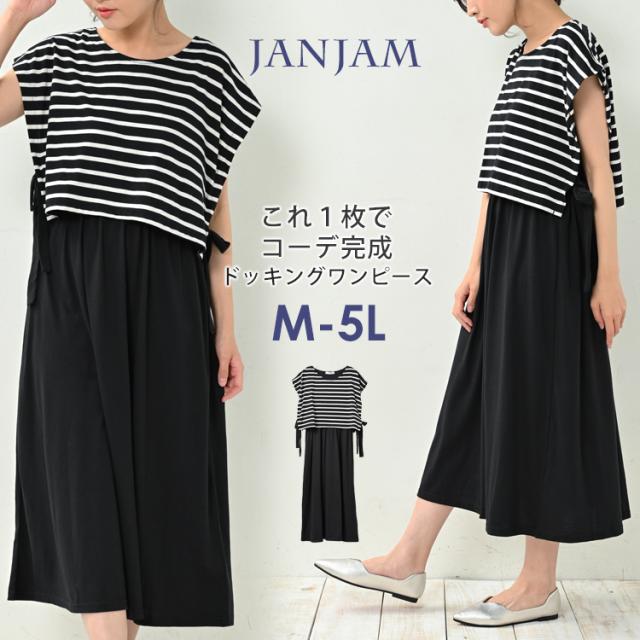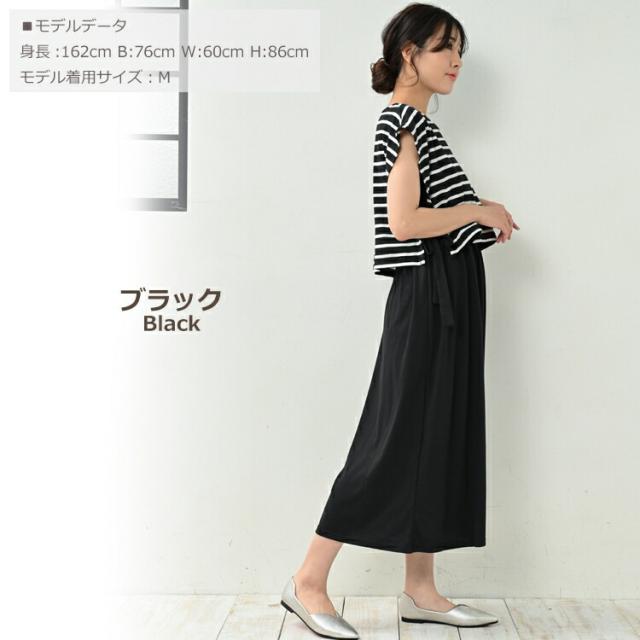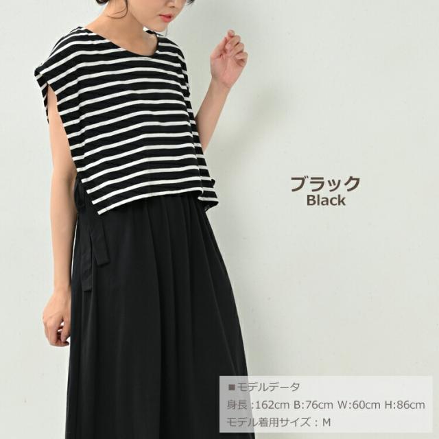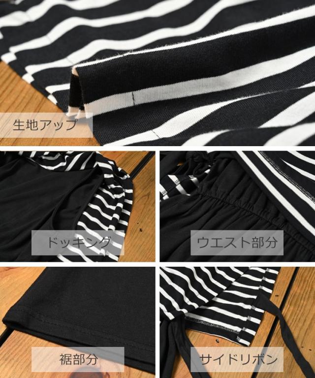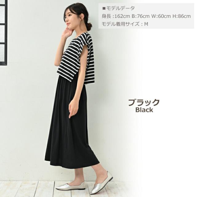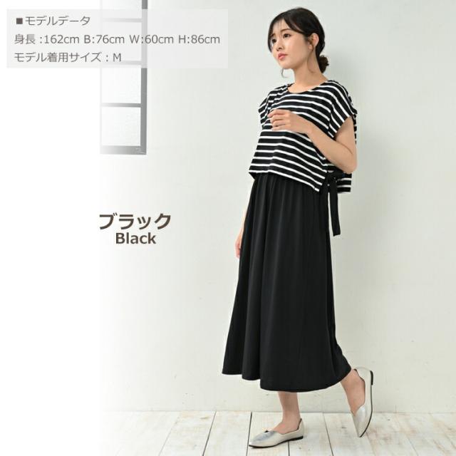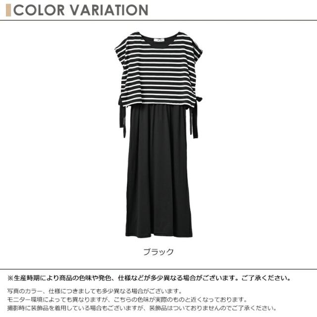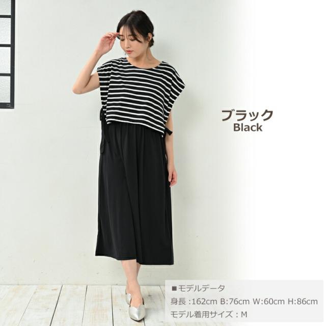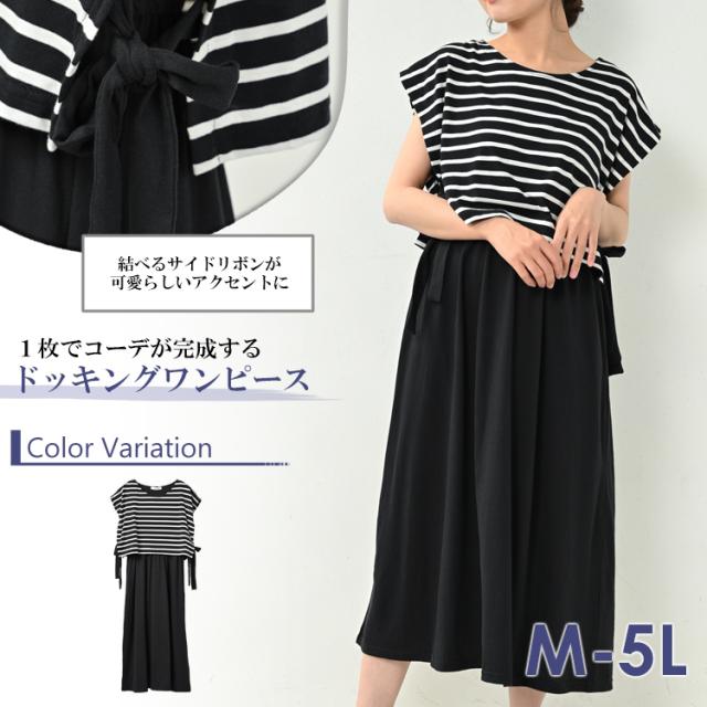 大きいサイズ レディース ドッキングワンピース 重ね着風 ロング丈 半袖 ボーダー サイドリボン M/LL/3L/4L/5L ゆったりサイズ ぽっちゃり女子 プラスサイズ