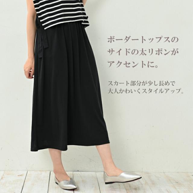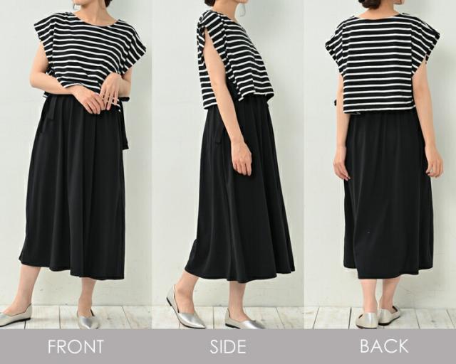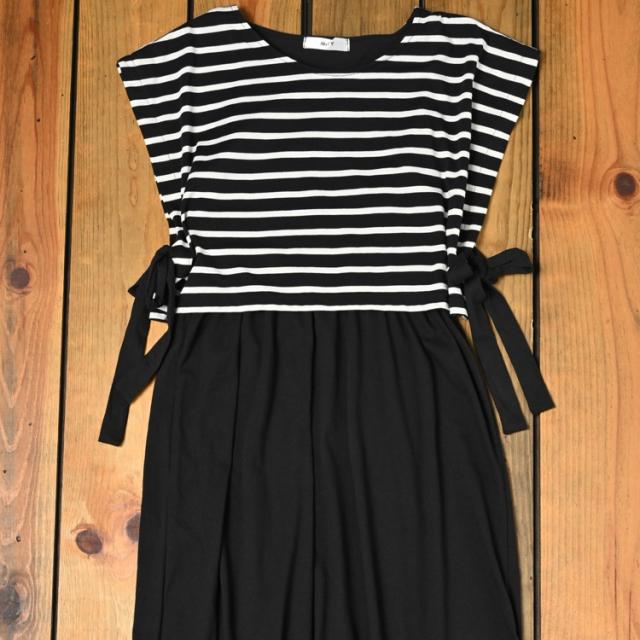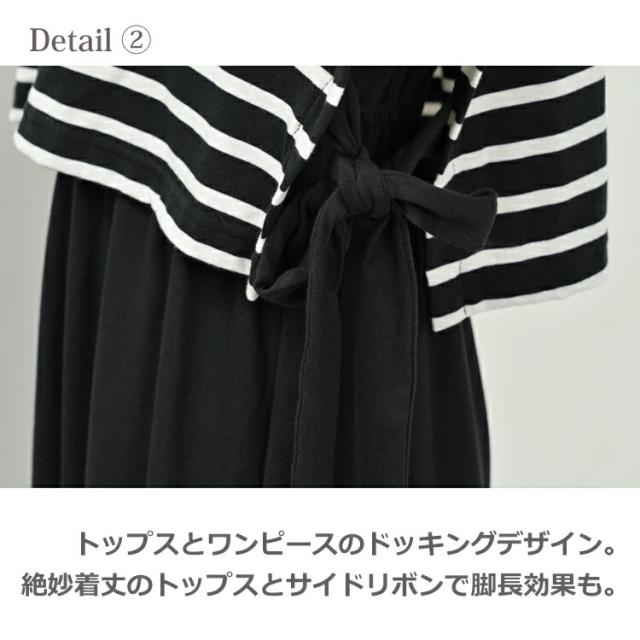 ボーダーT×ロングスカートの ドッキングデザインワンピース。 ボーダートップスのサイドの太リボンがアクセント。 絶妙着丈のトップスと合わせて脚長効果も。 これ1枚でスタイリングが完成する万能アイテムです。 |