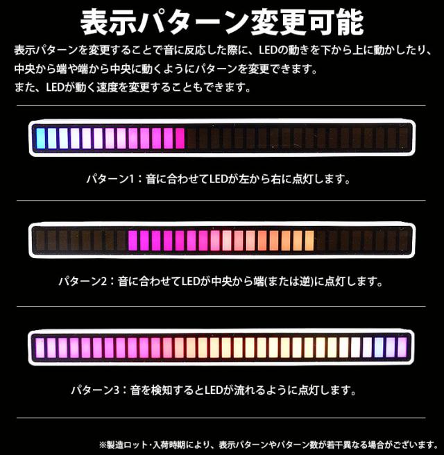 表示パターンを変更することで音に反応した際に、LEDの動きを下から上に動かしたり、中央から端や端から中央に動くようにパターンを変更できます。