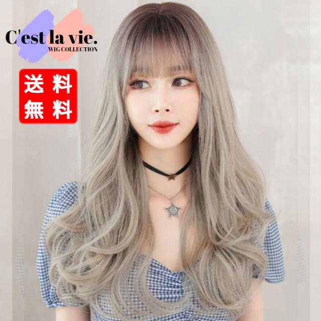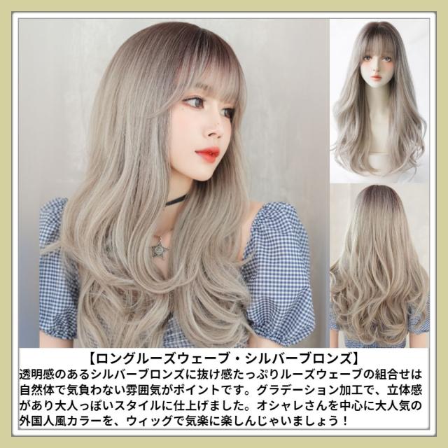 翌日出荷 フルウィッグ ロング ルーズ ウェーブ シルバー ブロンズ 医療用 かつら ネット付き 自然 小顔