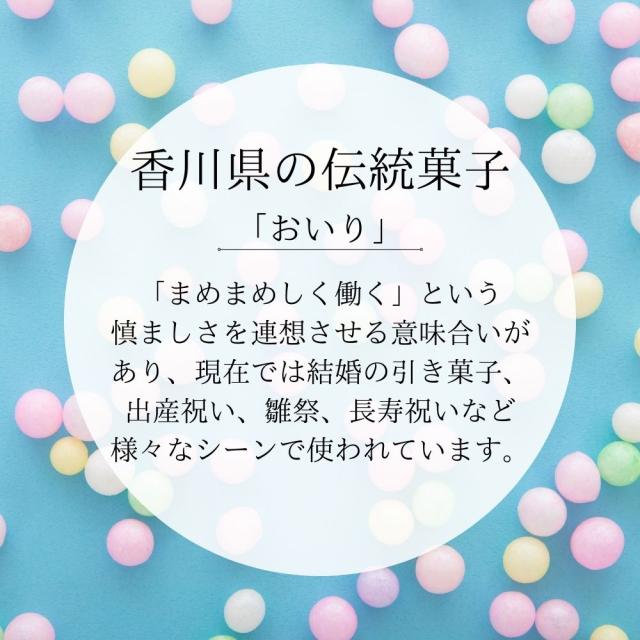 | 商品説明 | 香川県の伝統菓子おいりです。嫁入り菓子として親しまれてきましたが、最近ではお土産やソフトクリームのトッピングでも大人気です。 カラフルで見た目も良く、食感の良い甘いお菓子です。 |