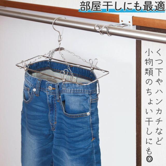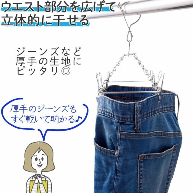 | 厚手のジーンズもすぐ乾く!ステンレスジーンズドライハンガーです。ウエスト部分を広げて立体的に干せるので風が通って乾きやすい!ジーンズなど厚手の生地にピッタリ◎部屋干しにも最適です。くつ下やハンカチなど小物類のちょい干しにも使えます。ピンチはサイズに合わせてスライド可能、ネックは360度回転して干しやすい♪風によるハンガーの落下防止フック付。サビにくく耐久性のあるステンレス製です。2本組。 |