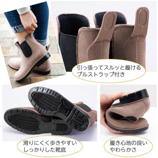 | 雨の日も晴れの日も、オールシーズン履きやすいスッキリしたフォルムのショート丈レインブーツ。レインシューズに見えないリアルなスエード革調とグレージュカラーがおしゃれ。カジュアルでもお出かけでも合わせやすいデザインです。脱ぎ履きラクチンなサイドゴア仕様とプルストラップ付き。滑りにくく歩きやすいしっかりした靴底で、雪の日にも活躍します。S・M・Lの3サイズ展開です。 |