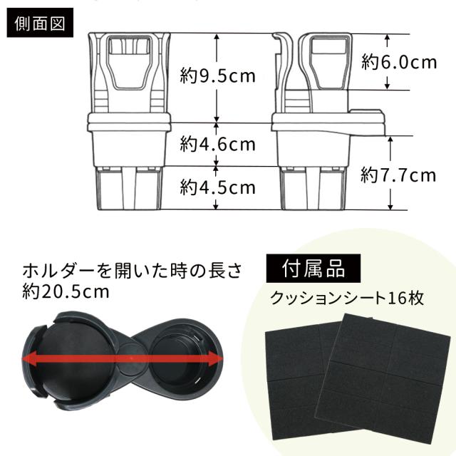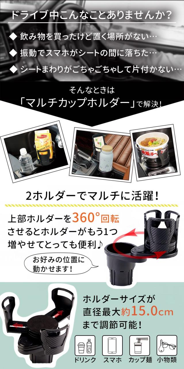 マルチカップホルダー/ドリンクホルダー/多機能カップホルダー/車用カップホルダー/ダブルカップ/車用/360度回転/調整/調節/可能/スマホホルダー/タブレット/取付簡単/紙パック/カップ麺/シンプル/デザイン/2in1/車載/車専用ホルダー/ペットボトル/水筒/iPad/ファミリー/ホルダー/収納/すっきり/車内収納/マルチホルダー/ブラック