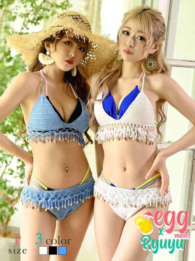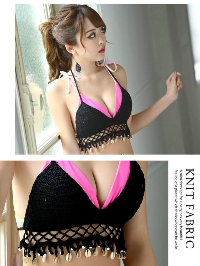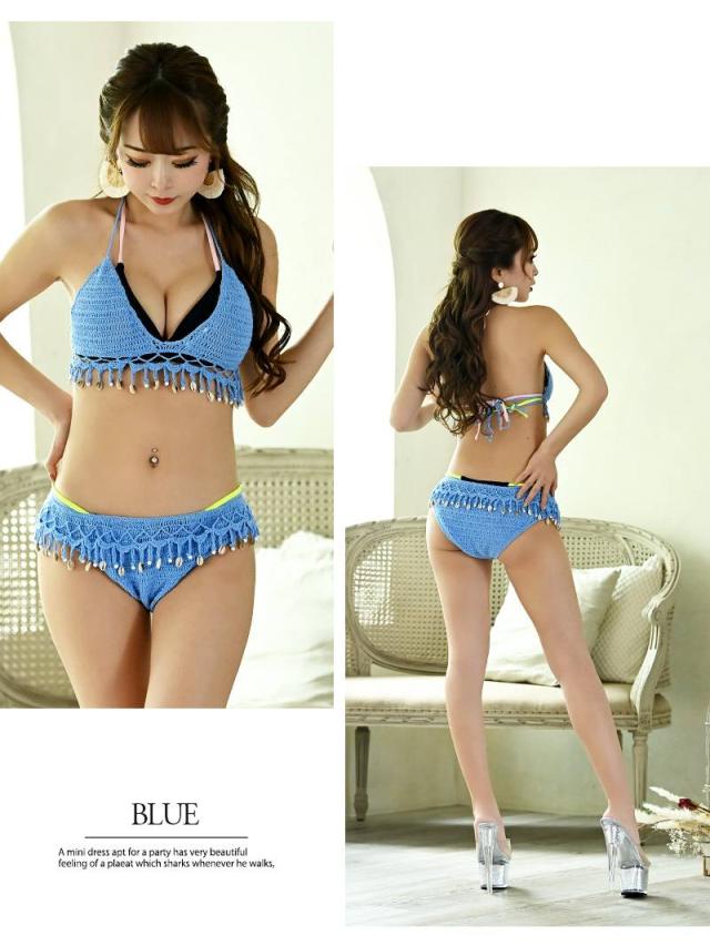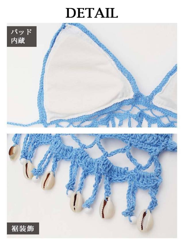 ☆柔らかいニット素材の韓国風水着はシェルモチーフのフリンジでアクセントをつけた夏にピッタリなハワイアン三角ビキニです♪