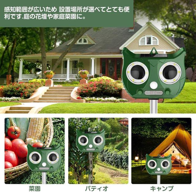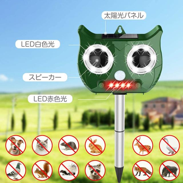 【動物撃退器:5つモード・多種類の動物除け】動物撃退器は庭などに設置することで、動物の侵入を防ぐ目的で作られた小型の超音波を発生する機械です。弊社の動物撃退器の超音波周波数範囲は13.5KHzから45.5KHzまでで、動物によって嫌いな周波数の音域が異なるため、動物撃退器から出る周波数の幅を変えることで、より多種類の動物を撃退できるということです。総合に5つのモードがありますので、多種類の動物を撃退できます。(モード1:13.5〜19.5KHz、ネズミ、ドブネズミ、犬、狐、マルテンなどの動物を撃退;モード2:19.5〜24.5KHz、猫、アライグマ、アナグマ、スカンクなどの動物;モード3:24.5〜45.5KHz、コウモリ、鳥、げつ歯類などの動物;モード4:強い点滅ライト、アライグマ、ノイシシ、テンなどの動物;モード5:可変な周波数と強い点滅:全ての動物と鳥を撃退しま す)。