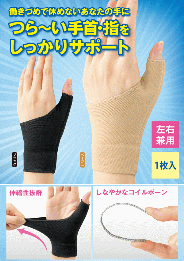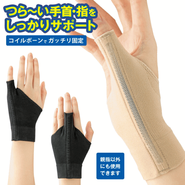 辛くても休めないあなたに!薄くても安心の固定力!医学博士監修、手首サポーター。指と手首の動きを制限する事で使い過ぎによる手首の負担を軽減します。動かすと不安のある指をしっかりサポートするコイルボーン内蔵。手首の安定をサポートする着圧編み。伸縮性の良い薄手のニット素材で着脱簡単。手仕事、家事、スポーツの間もしっかりサポート。左右兼用です。■適応目安サイズ(手首周り)M:約14〜17cm、L:約17〜20cm■材質:ナイロン、ポリウレタン■カラー:ブラック、ベージュ■サイズ:M、L【ネコポスでのお届けとなります】送料無料ですが代引き発送はできません。発送後一部地域を除き2〜3日で投函となります。ネコポスには配達保証がありません。宅配便での発送をご希望の場合は店舗指定の送料770円が別途掛かります。その際はご注文時にご入力お願い致します。ご注文数によっては宅配便で発送させて頂く場合があります。他商品との同梱及び代引き発送、配達日時指定はできません。