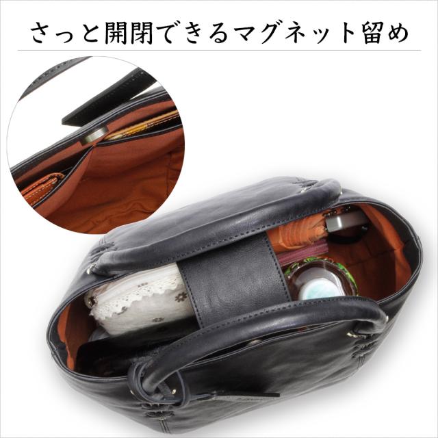 本革ならではの高級感で、通勤やショッピング、ランチ〜散策等、荷物が少し多めでも安心できる『愛着』深まるトートバッグです。