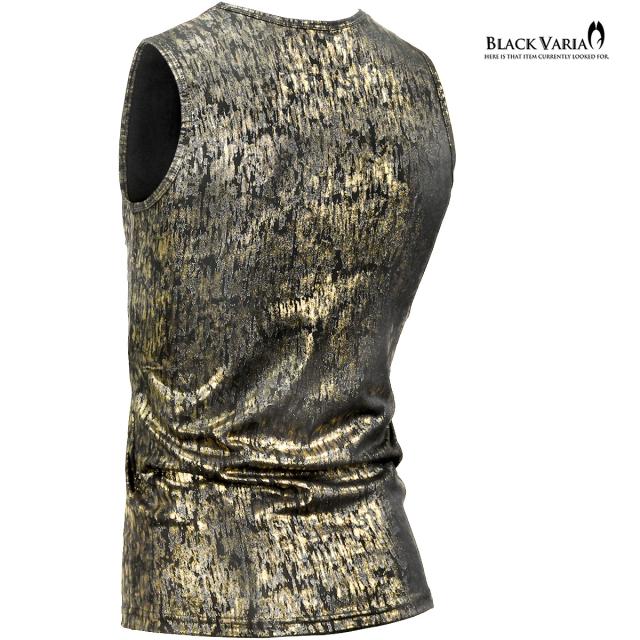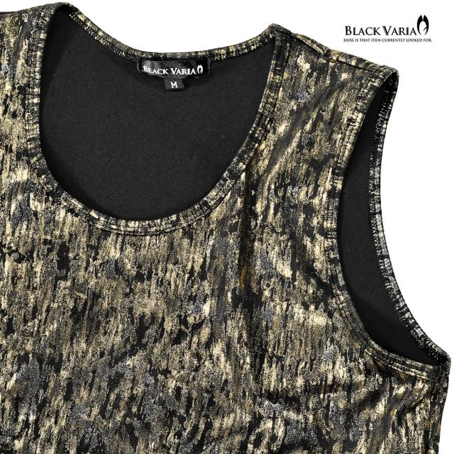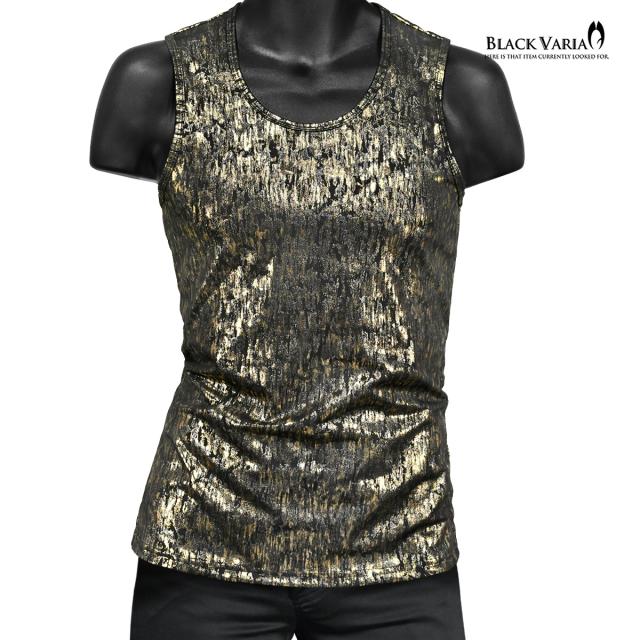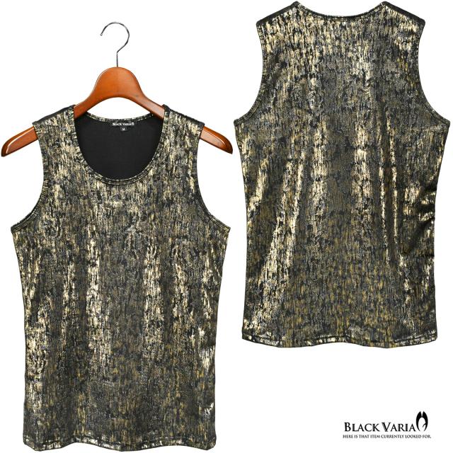 メール便可/1枚まで タンクトップ ムラ柄 箔プリント メンズ ストレッチ 光沢 細身 mens(ゴールド金ブラック黒) 213703