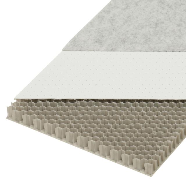 軽量・高剛性素材のポリプロピレン素材ハニカムパネルの表面に小さな穴を開け吸音効果を向上しています。