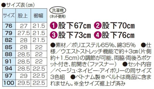 ●仕様/ウエストストレッチ機能で約+3cm(片側約+1.5cm)の調節が可能、両脇・両後ろポケット付き、前ファスナー