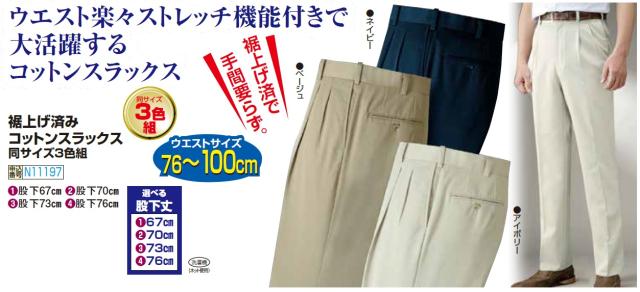 裾上げ済みコットンスラックス(同サイズ3色組) 選べる股下丈 長ズボン メンズ 紳士服 男性 シニア コットンパンツ 綿パン 紺色 ベージュ アイボリー ネイビー シンプル ストレッチパンツ シニアファッション 40代 50代 60代 70代 80代 父の日 お父さん 裾上げ済み 綿スラックス ストレッチスラックス 大きいサイズ ギフト プレゼント 敬老の日 春夏秋冬 通年 オールシーズン 綿混 センタープレス