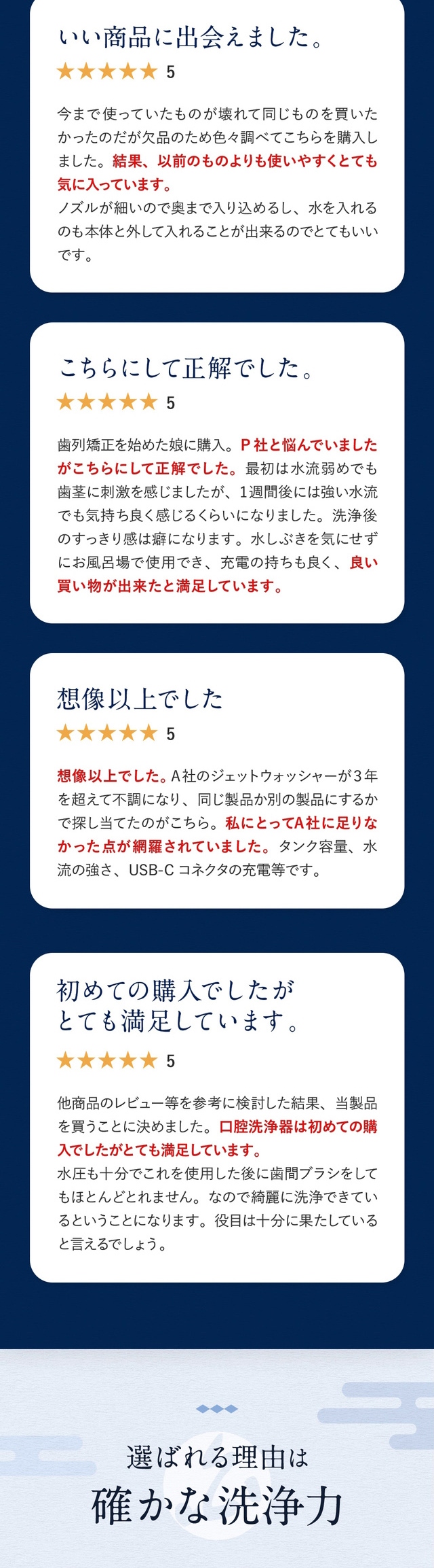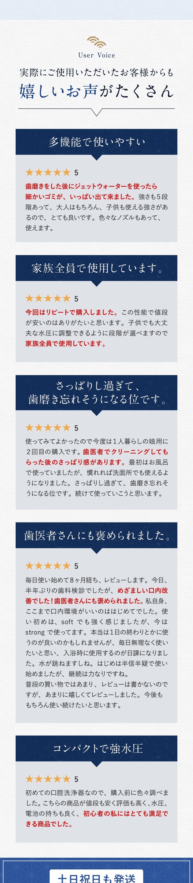 - 他社のウォーターピックが1年半で壊れてしまい 困っていたところ 一万円以下で買えるこちらの商品を見つけ 試しに買ってみたところ こちらの方が音も気にならず使いやすく良かったです。