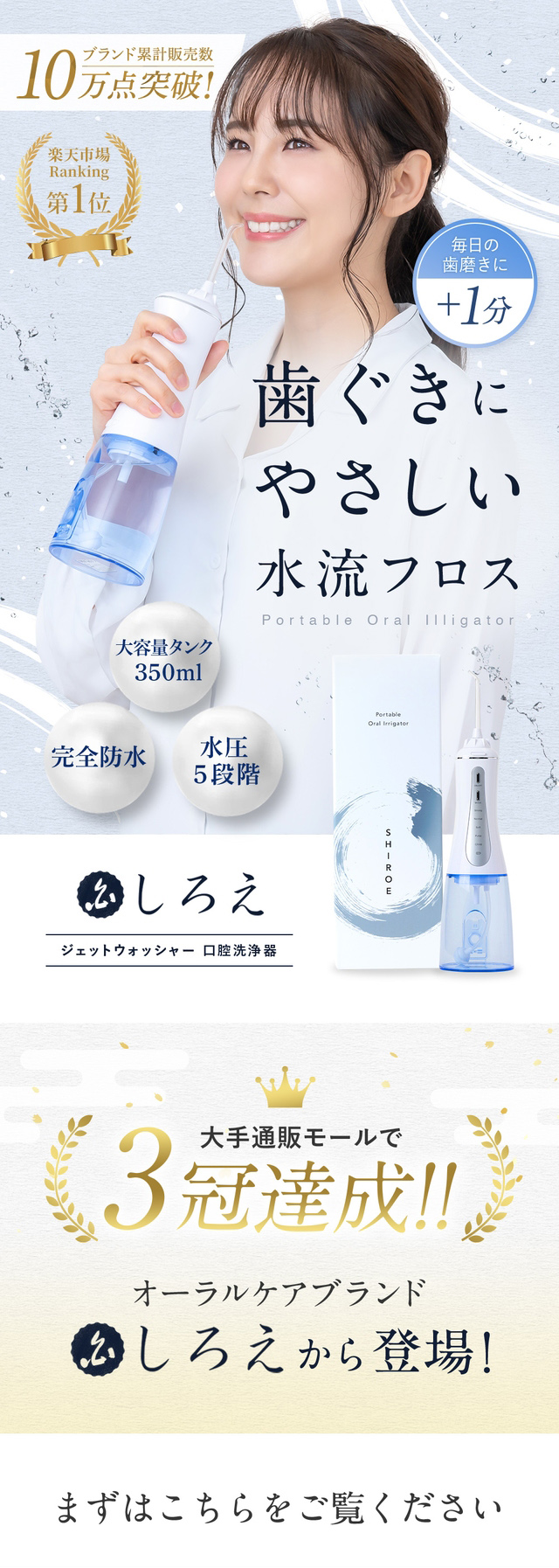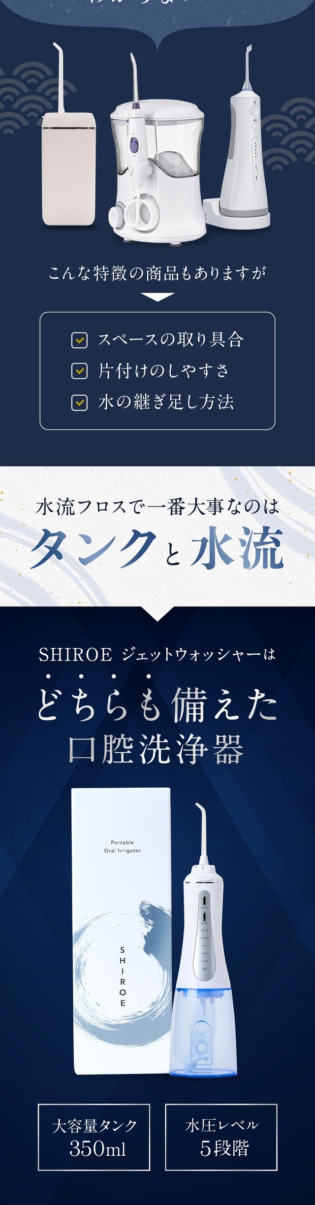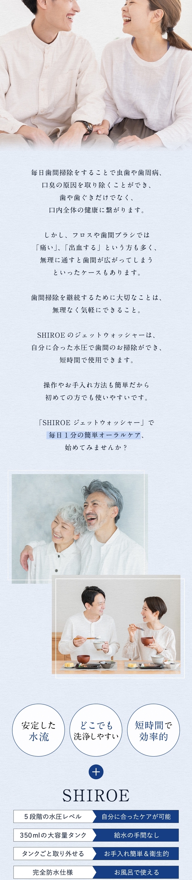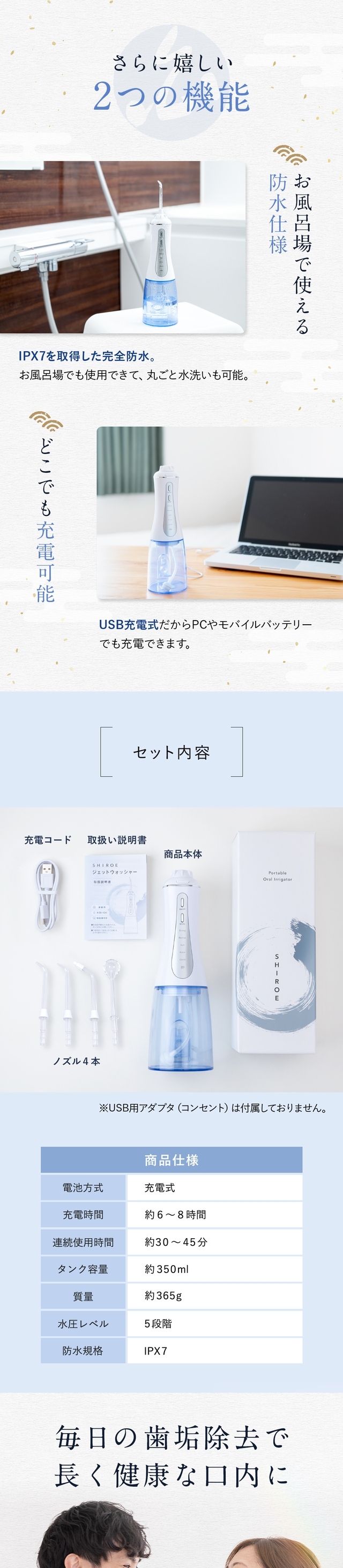 ジェットウォッシャー 口腔洗浄器【SHIROE ジェットウォッシャー】口腔洗浄機 ウォーターフロス ウォーターピック 防水 フロス デンタルフロス 歯間ブラシ 歯間 糸ようじ 奥歯 歯磨き 虫歯 歯周病 口臭 歯垢 プラーク 歯石 歯周ポケット 治療歯 しろえ