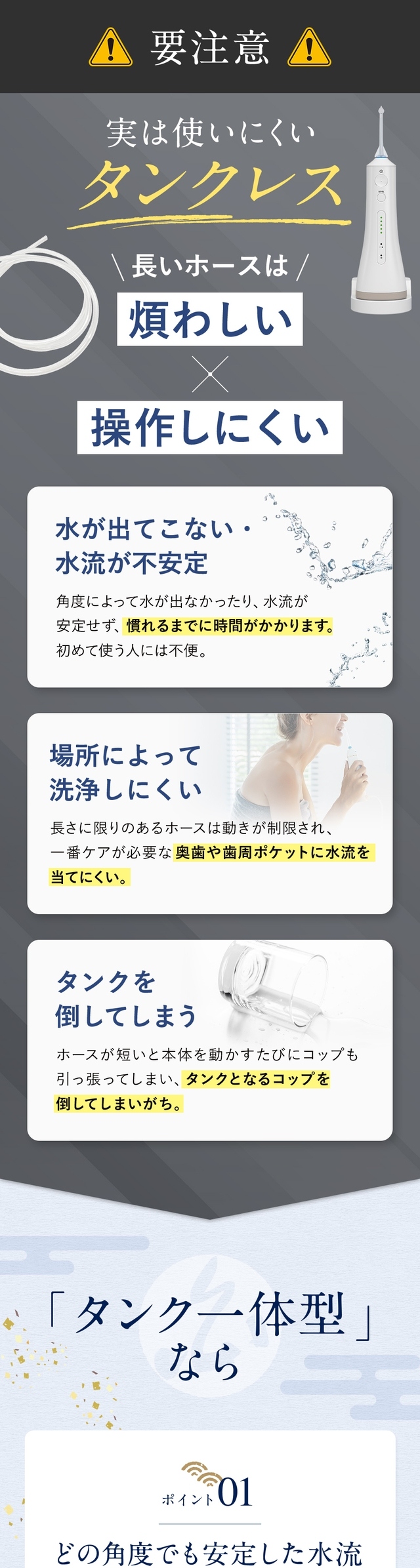 - 初めて口腔洗浄器を購入しました。水しぶきがすごいので、風呂で使っています。タンクの容量は、もう少し欲しい感じです。歯はツルツルになります。取り扱っている時にうっかりスイッチをオンにしてしまい、不意に冷...