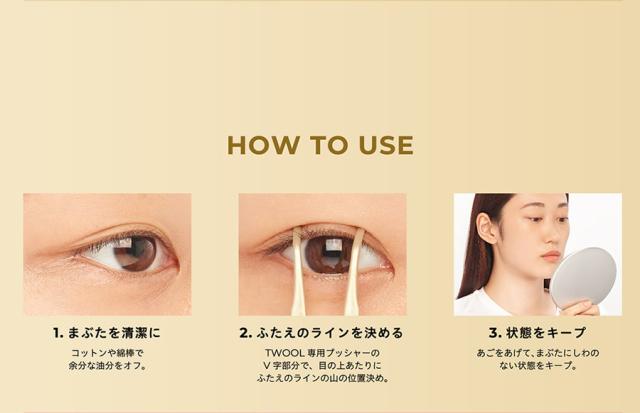 完全に液が乾いてから、付属のプッシャーでふたえラインの中央あたりを軽く押さえながら、そっと目を開けます。