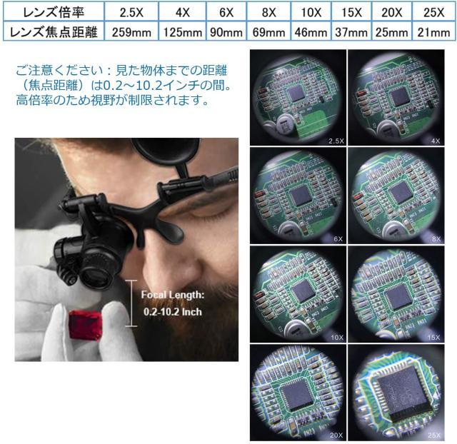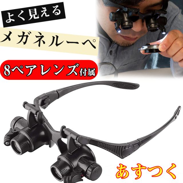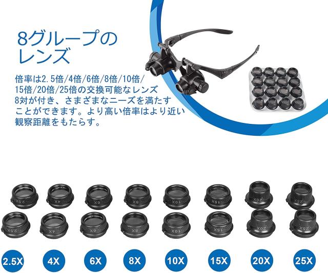 当日発送 拡大鏡 ルーペ メガネ LED ライト付き 8組レンズ 作業用ルーペ 軽量 跳ね上げ ルーペ眼鏡 メガネルーペ 虫眼鏡 25倍 10倍 15倍 20倍 ヘッドルーペ 両眼