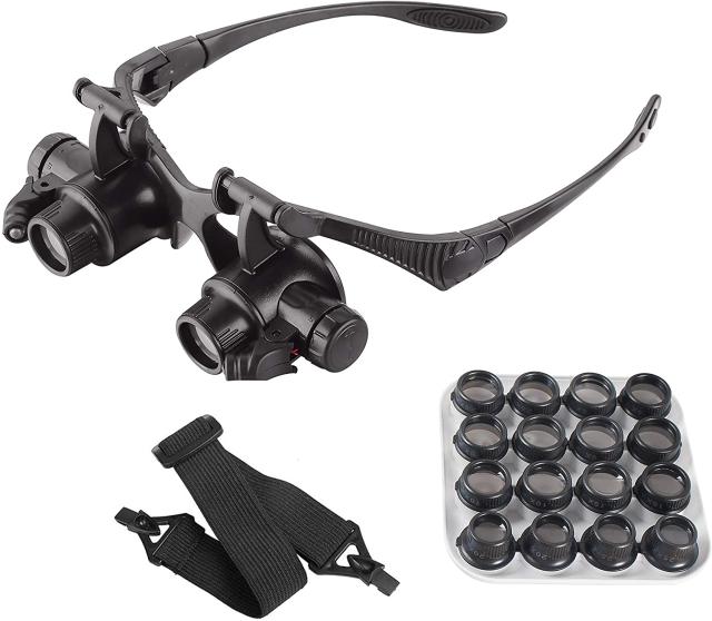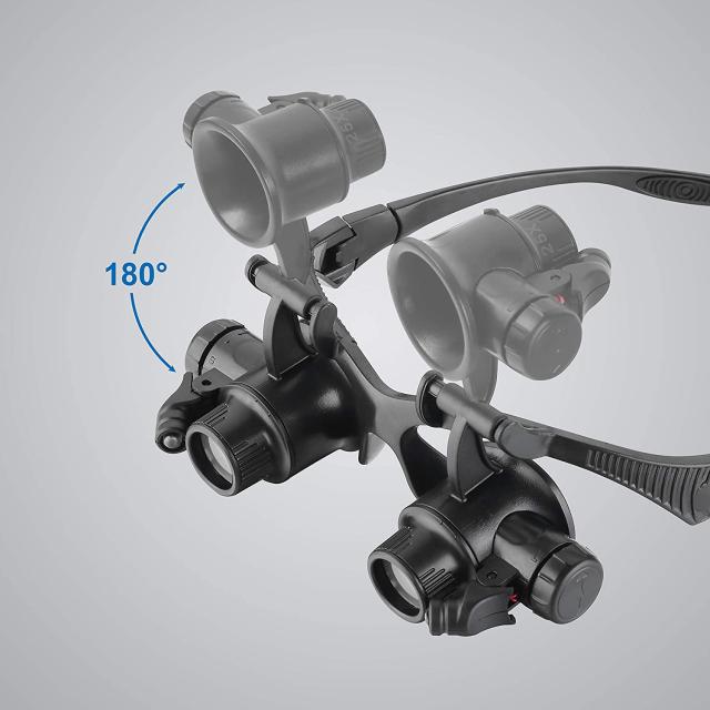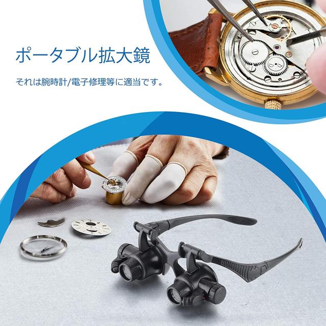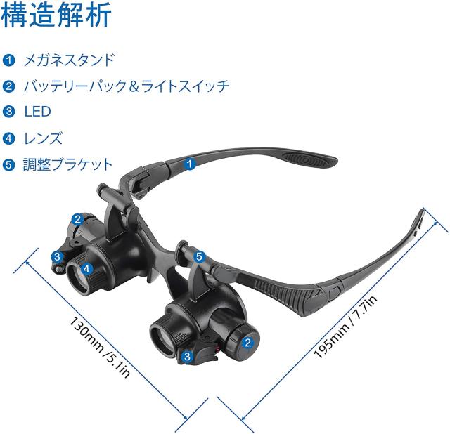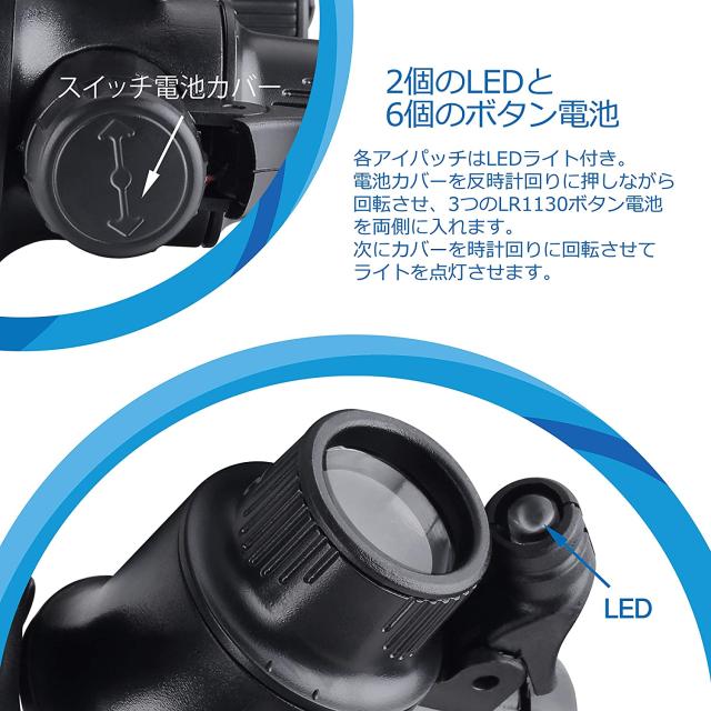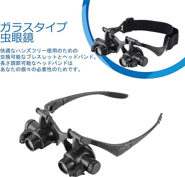 LEDライト−暗い場所での作業に役立つように、2個の調節可能なLEDを備えた左右両眼メガネ型ルーペです。