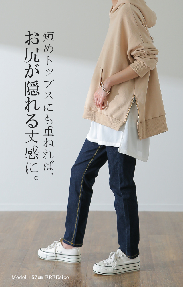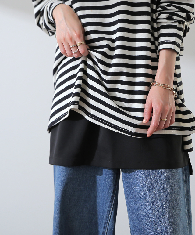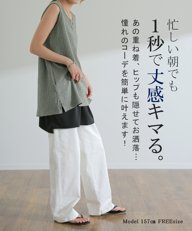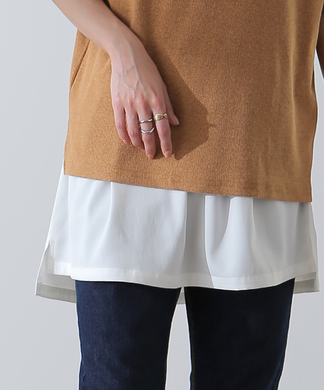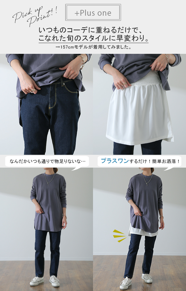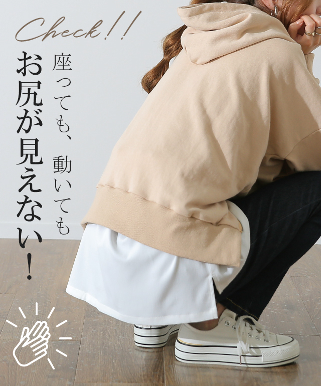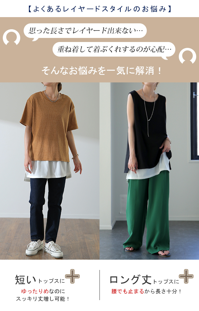 トップスの下に合わせればトレンドの裾レイヤード風に見える便利アイテム。