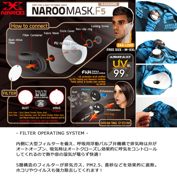 ■NAROO MASK(ナルーマスク) 高性能フィルター付 UVカット フェイスマスク / 速乾 防寒 ネックウォーマー F5■