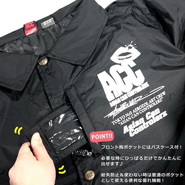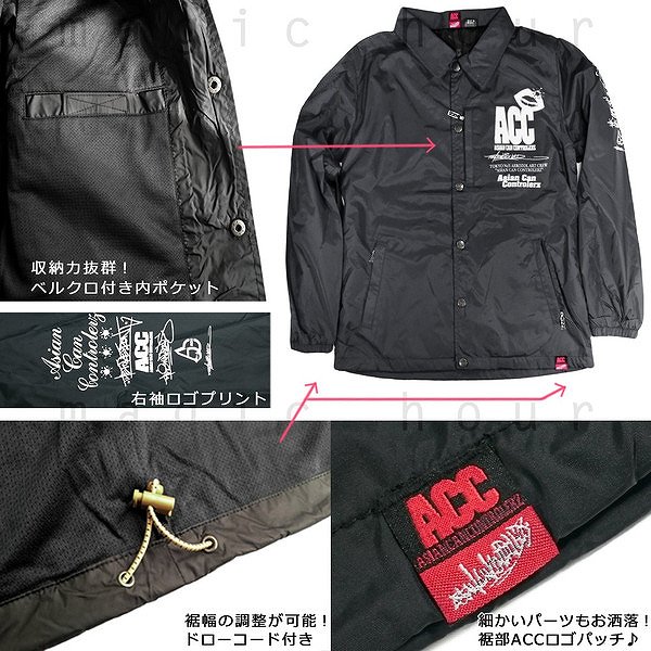 スノーボードブランドが提案するコーチジャケット。 今期も大注目の人気アイテム! 撥水&防水仕様のシンプルデザインでタウンユースからスポーツシーンまで大活躍! スノボなどのウィンタースポーツはもちろん、バイク・スケート・自転車・通勤・通学など多くの用途に使え1つあると便利! 左胸ポケットにパスケースを配置。 フロントポケットはファスナー&内ポケットはベルクロ付きで、落し物の心配なし! 細部のパーツまですべてACCロゴ入りで高級感のある仕上がりに♪ ロングパーカーとの相性も◎なので、レイヤードスタイルに挑戦したい方にも! |