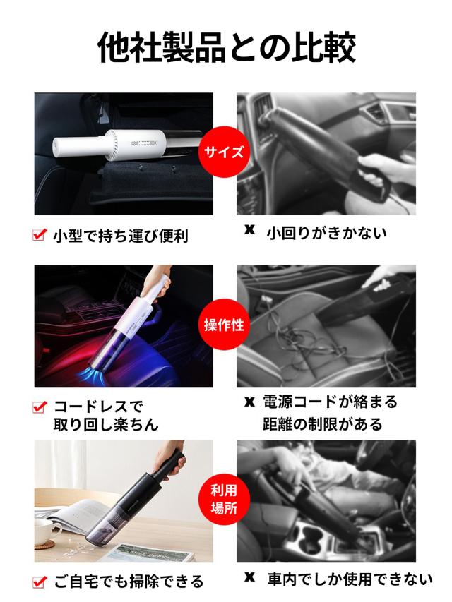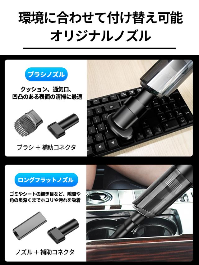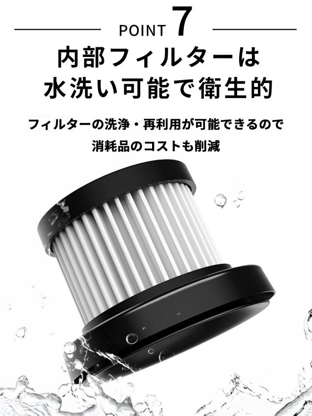 2種類の交換用ヘッドを搭載したコードレス式ハンディクリーナー。 車内のホコリや食べかすを掃除することができます。 また、家庭でも、マットレスやソファ、窓やキーボードについたホコリや髪の毛などを効率効率的に掃除することもできます。 細くて狭い箇所など、気になるところもお掃除楽々です。(フィルターを水洗いしたり、フィルターが水に浸かったりすると、ハンディクリーナーの吸引力がなくなる原因になりますので、フィルターを乾かしてからご使用ください)