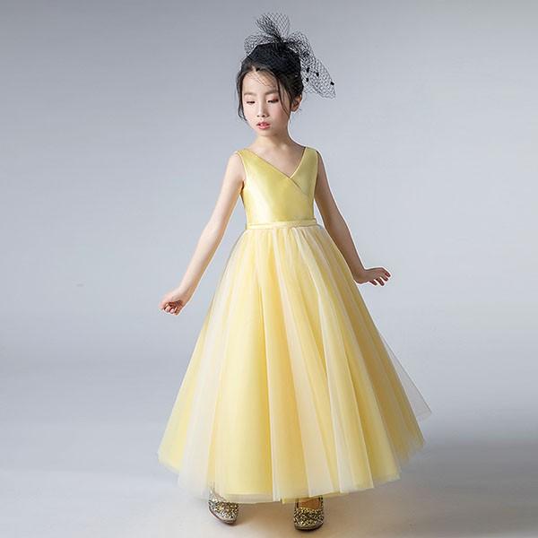 ピアノ発表会 中学生 ワンピース ドレス 女の子 ノースリーブ ロングドレス 子供 パーティードレス 発表会 子ども 結婚式 七五三 ピアノ キッズドレス プリンセス お姫様 フラワーガール ベールガール リングガール 黄色 da155n1n1c9
