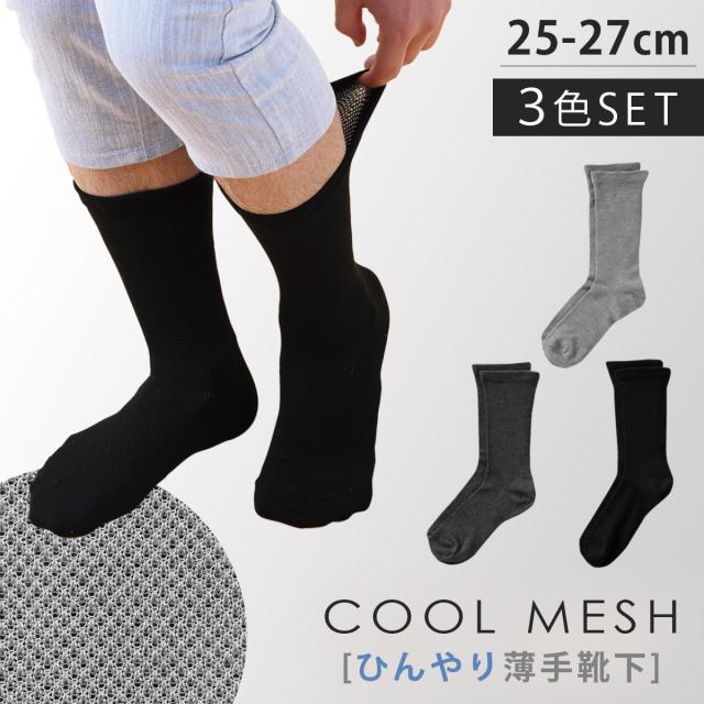 靴下 メンズ 3色組 25-27cm 接触冷感 ひんやり メッシュ 夏用 薄手 無地 履き口 ゆったり 接触冷感メッシュ薄手メンズソックス