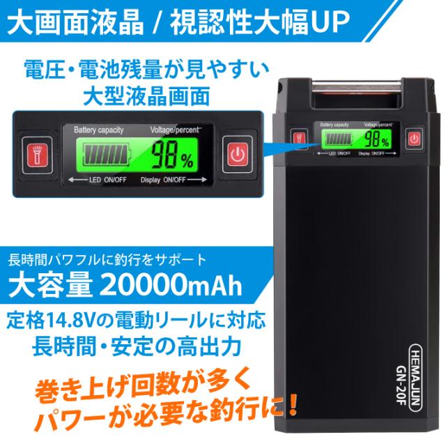 【1年保証】【公式】HEMAJUN(ヘマジュン)電動リールバッテリー 20000mAh 充電器 保護ケース 調整ベルトセット 14.8V対応の電動リール DAIWA SHIMANOと互換性あり GN-20F 電動リール用 バッテリー LEDライト付き リール用バッテリー 充電器 釣り 船釣り 落とし込み