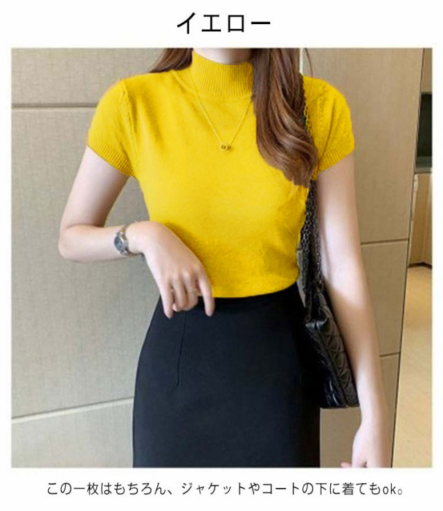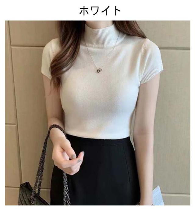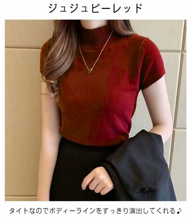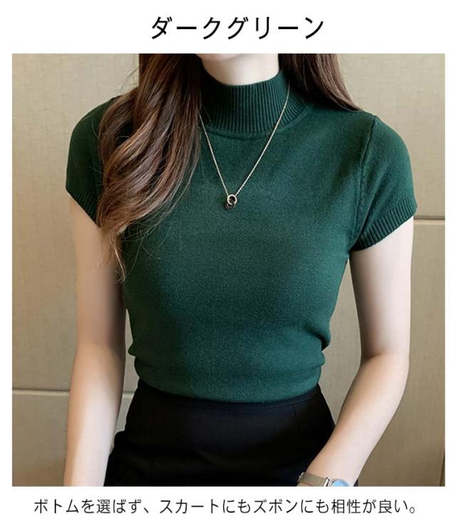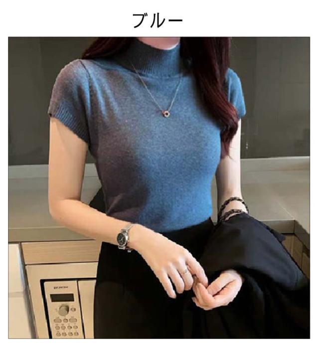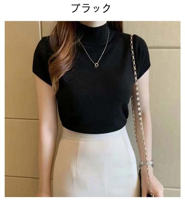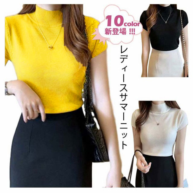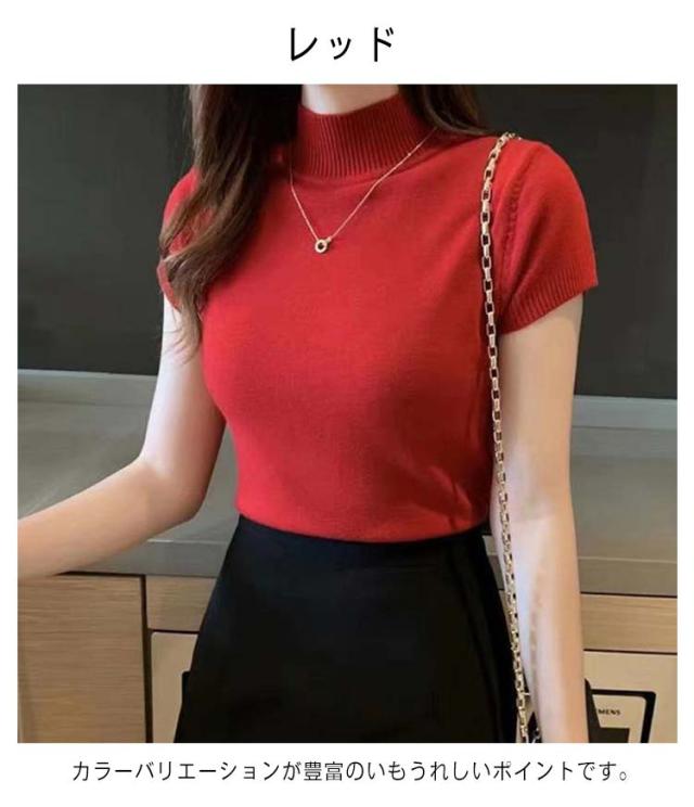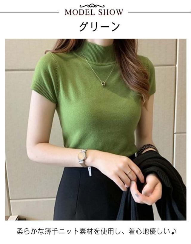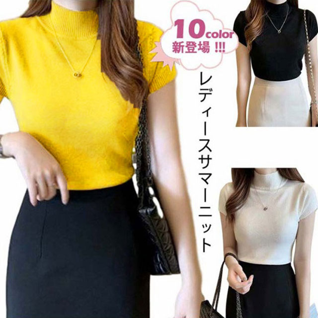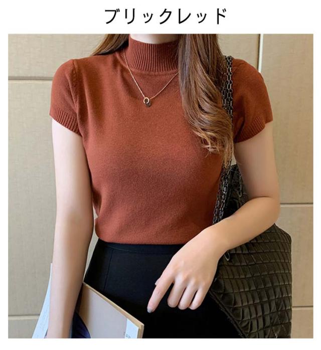 サマーニット レディース 春 夏 ニット トップス 薄手 プルオーバー ニットセーター ラウンドネック ハーフハイネック 半袖 Tシャツ カットソー カジュアル フェミニン シンプル 送料無料
