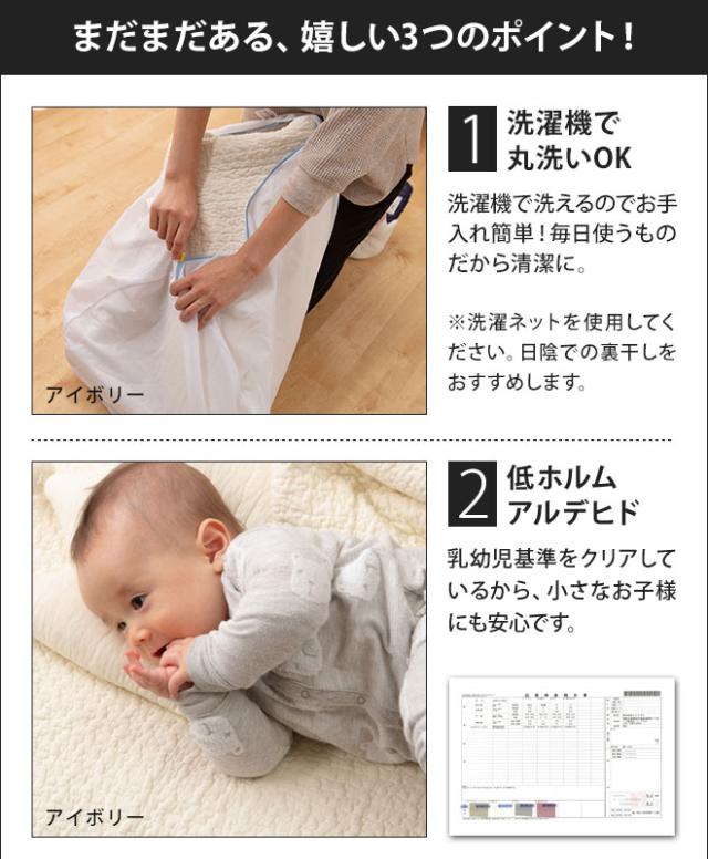 防水機能はありませんが、綿100%だから吸水性はばつぐん!リバーシブル仕様で、汗やよだれをしっかり吸って、寝心地は快適なまま。洗濯機で洗えるからこまめにお手入れできて、清潔に保てます。