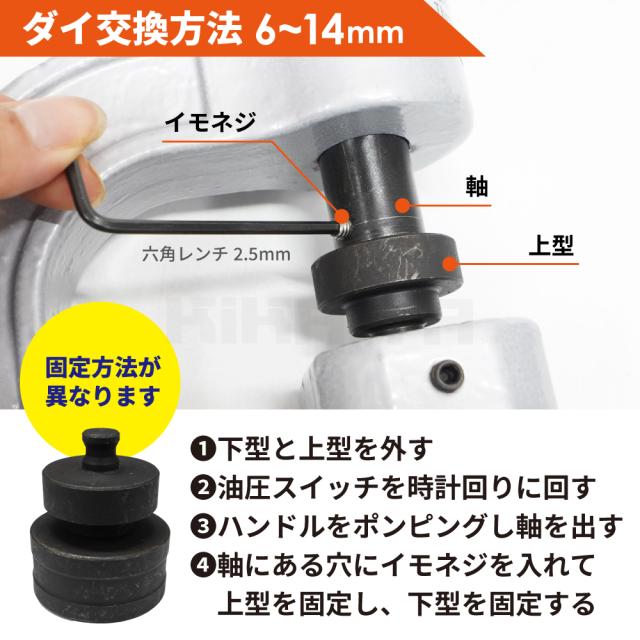 下穴不要!焼き入れ処理で耐久性あり! ●油圧式ホールパンチャー(SYD-32、SYD-35)専用の交換用パンチダイです ●穴あけサイズは6mm,8mm,10mm,12mm,14mm, 16mm,20mm,22mm,25mm,28mm,32mmの11種類 ●ダイの交換は、SYD-35に付属の六角レンチで、上型→下型の順に交換してください ●6〜14mmはイモネジ付(※SYD-35は六角レンチ2.5mmが別途必要です) ※本体は別売りです ※画像はイメージです ※サイズはカートに入れる際、選択してください *別売り本体はこちら 「直立型油圧式ホールパンチャー32mm(SYD-32)」 ※横型油圧式ホールパンチャー(SYD-35)は販売終了しました 品番:SYD-35-D |
