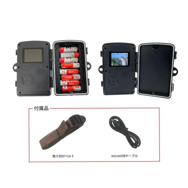 熱感知で作動する乾電池式のセキュリティーカメラです。防水等級IP66ですので、屋内外、昼夜問わずに動画・静止画の撮影ができます。本体内部に2インチ液晶モニターが付いており、その場で映像・写真を確認できます。CMOS解像度130万ピクセル、32GBのSDカード対応です。写真、映像、写真+映像の3種類を選択でき、時間・タイマー動作なども設定可能です。費用を抑えた簡単な害獣・防犯対策に。使用例:害獣監視・駐車場監視・不法投棄監視・倉庫監視・現場事務所監視に。