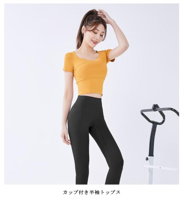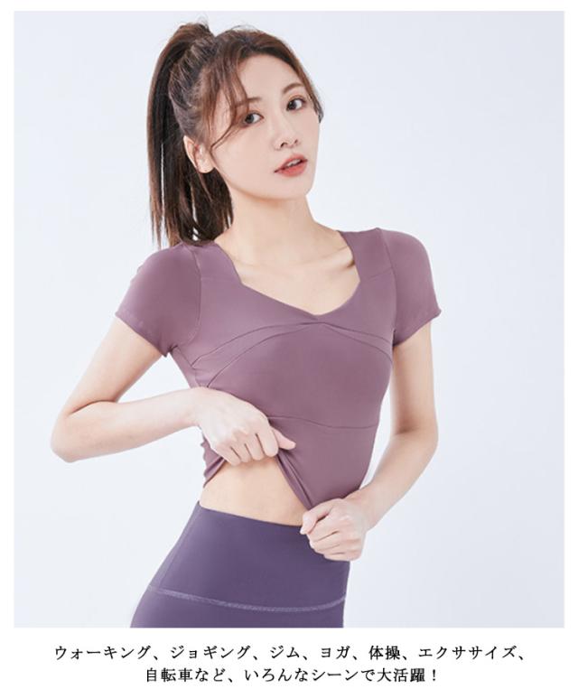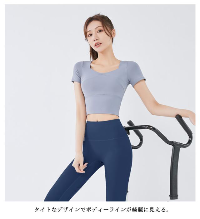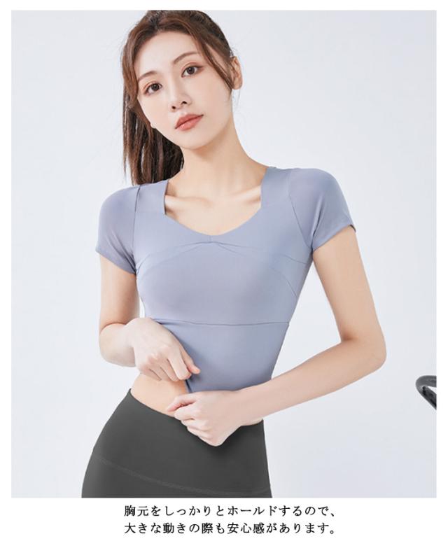 ヨガウェア スポーツウェア 半袖 レディース トップス タンクトップ風 長袖 カップ付き ストレッチ 吸汗速乾 スポーツ ジムウェア 運動会 ランニング ウォーキング 送料無料 ライトブルー ブルー ブラウン ブラック Yoga Wear