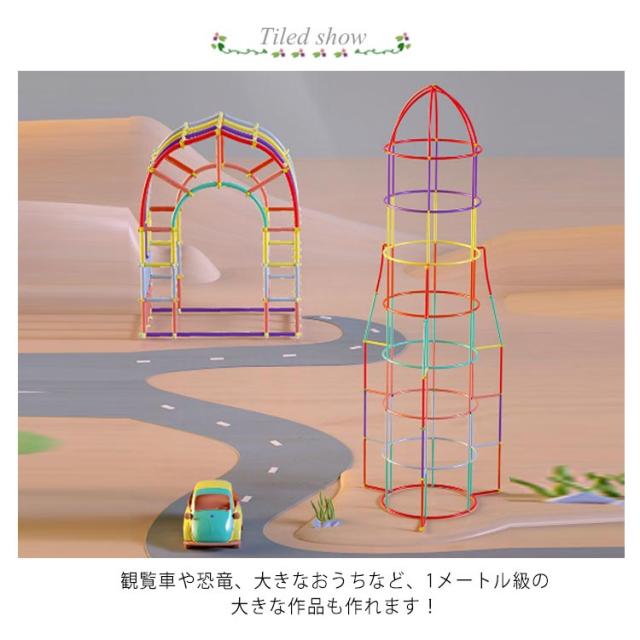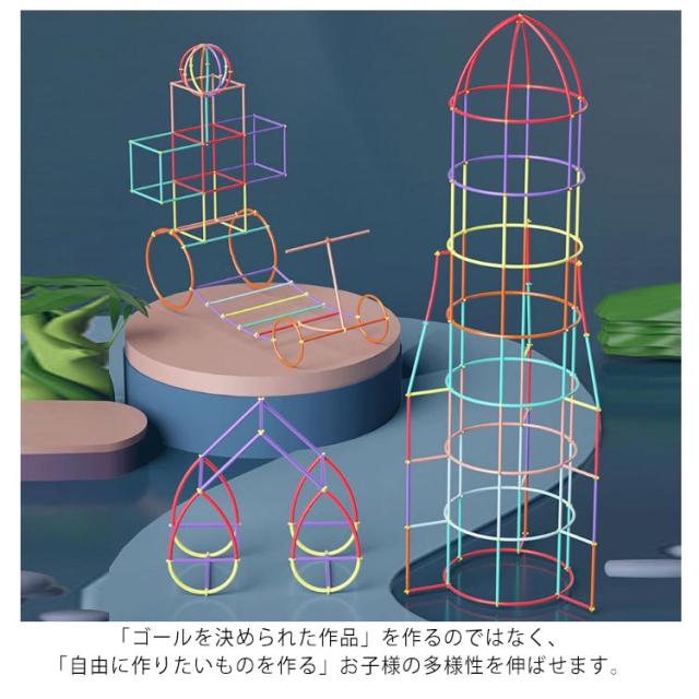 | 600ピースで作れる作品は無限大!パイプの立体パズルが新登場。 観覧車や恐竜、大きなおうちなど、1メートル級の大きな作品も作れます! 「ゴールを決められた作品」を作るのではなく、「自由に作りたいものを作る」お子様の多様性を伸ばせます。 シンプルなおもちゃは創造力が膨らみ、遊びを固定させず、成長と共に遊び方が変わり、飽きることなく長く遊ぶことができます。 一人ではもちろん、家族や友人と一緒に楽しむことが出来、お子様へのプレゼントにもお喜び頂けます。 | |
