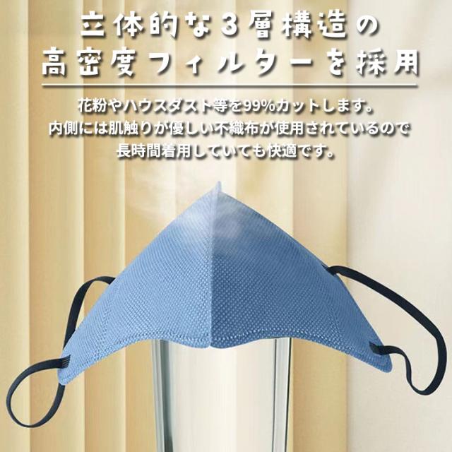 立体デザインなので顔にフィットして花粉やハウスダスト等から守ります