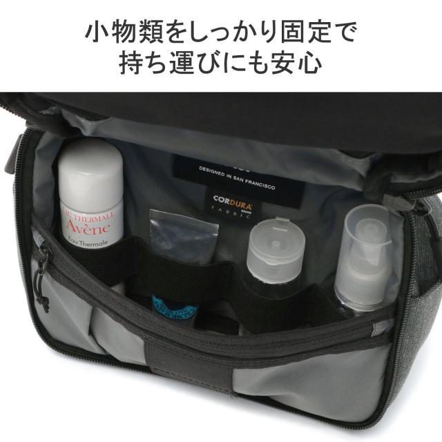 | 仕様 | <外側> ジップポケット(L)×2 歯ブラシ用ポケット×2 <内側> メッシュジップポケット(L)×1 ジップポケット(M)×1 フック×1 ゴムバンド×6 |