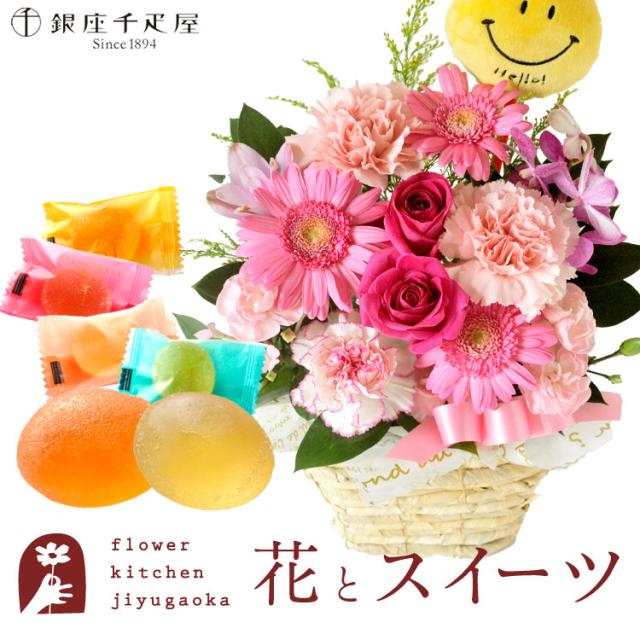 花とスイーツのセット ピック付き 季節のフラワーギフト「ピンク」+【銀座千疋屋】ひとくちフルーツゼリーセット 送料無料 プレゼント 誕生日 記念日 お祝い花 即日発送 あすつく メッセージカード FKAASW