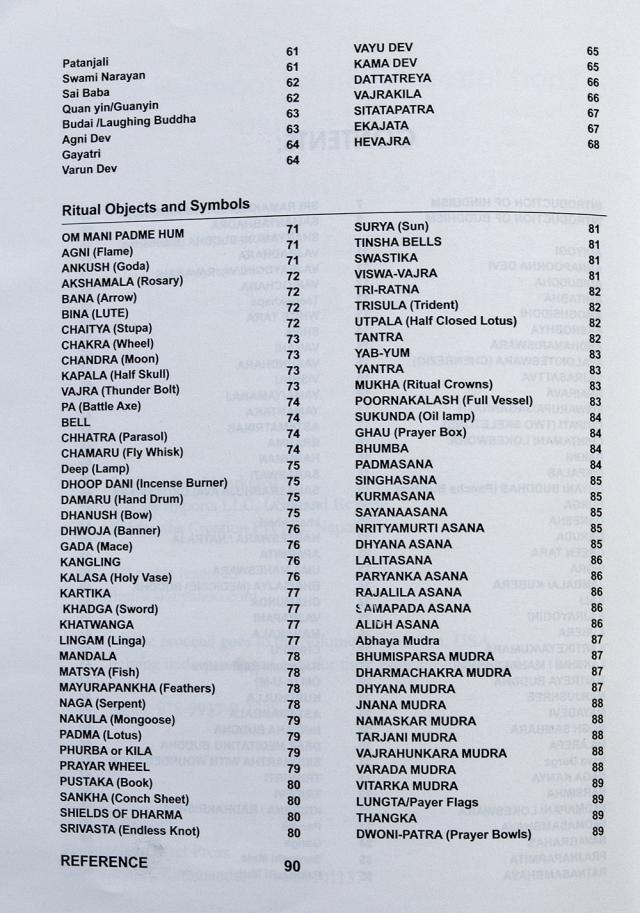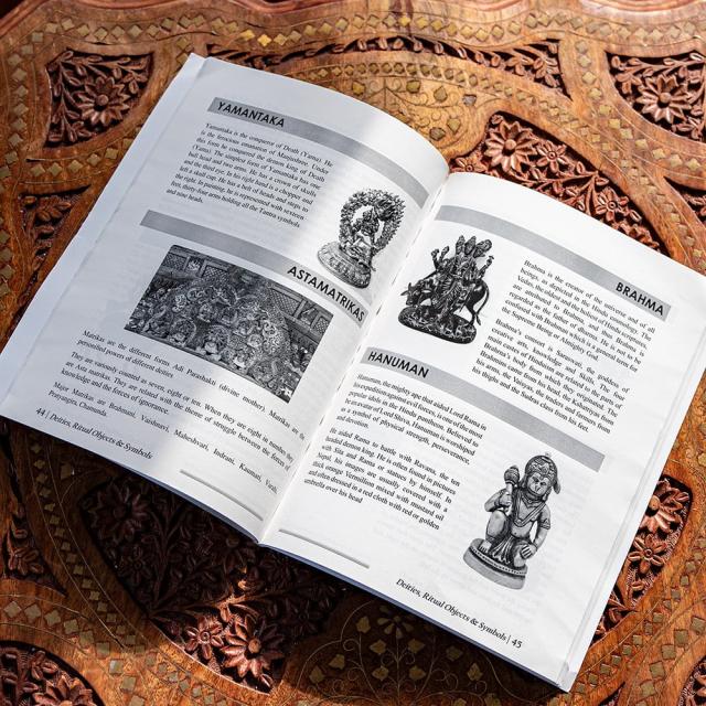 タイトルの通り、ヒンドゥ教・仏教の神々や宗教的なオブジェクトの数々についての概説書です。ヒンドゥ(そして仏教)は歴史が長く膨大な広がりを持っているため概観することすら非常に難しいものです。そしてそこに登場する神々も一見してどんな神様なのかわからない…ということが多々あります。そんなときに痒いところに手が届く嬉しい本です。本書ではほぼすべての神様に図像が寄せられているのです。名前がわかるだけでも調べる手がかりになりますね。本書では比較的マイナーな神様も広範に取り扱われています。その一端は掲載写真からもうかがえることでしょう。ティラキタスタッフも神様の勉強用に手元においておきたい一冊です。