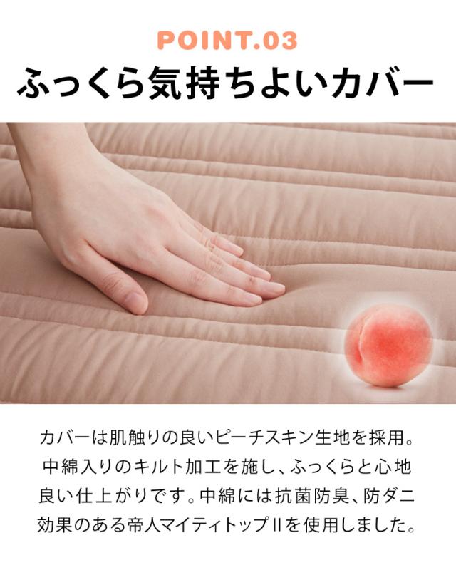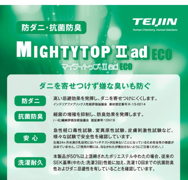 表生地キルト加工処理、中綿にマイティトップを使用し、防ダニ・抗菌防臭機能がございます。
