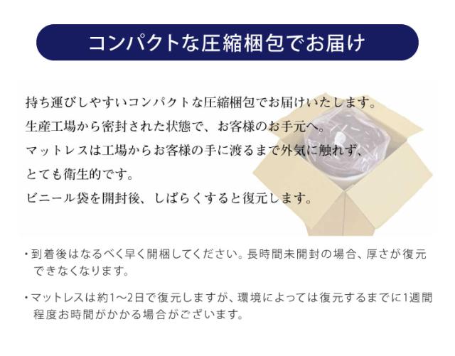 ご使用時は、マットレス同士を面ファスナーで連結。収納時は、連結を外してそれぞれ収納できる三つ折りタイプ。コンパクトな圧縮梱包にてお客様へお届け致します。